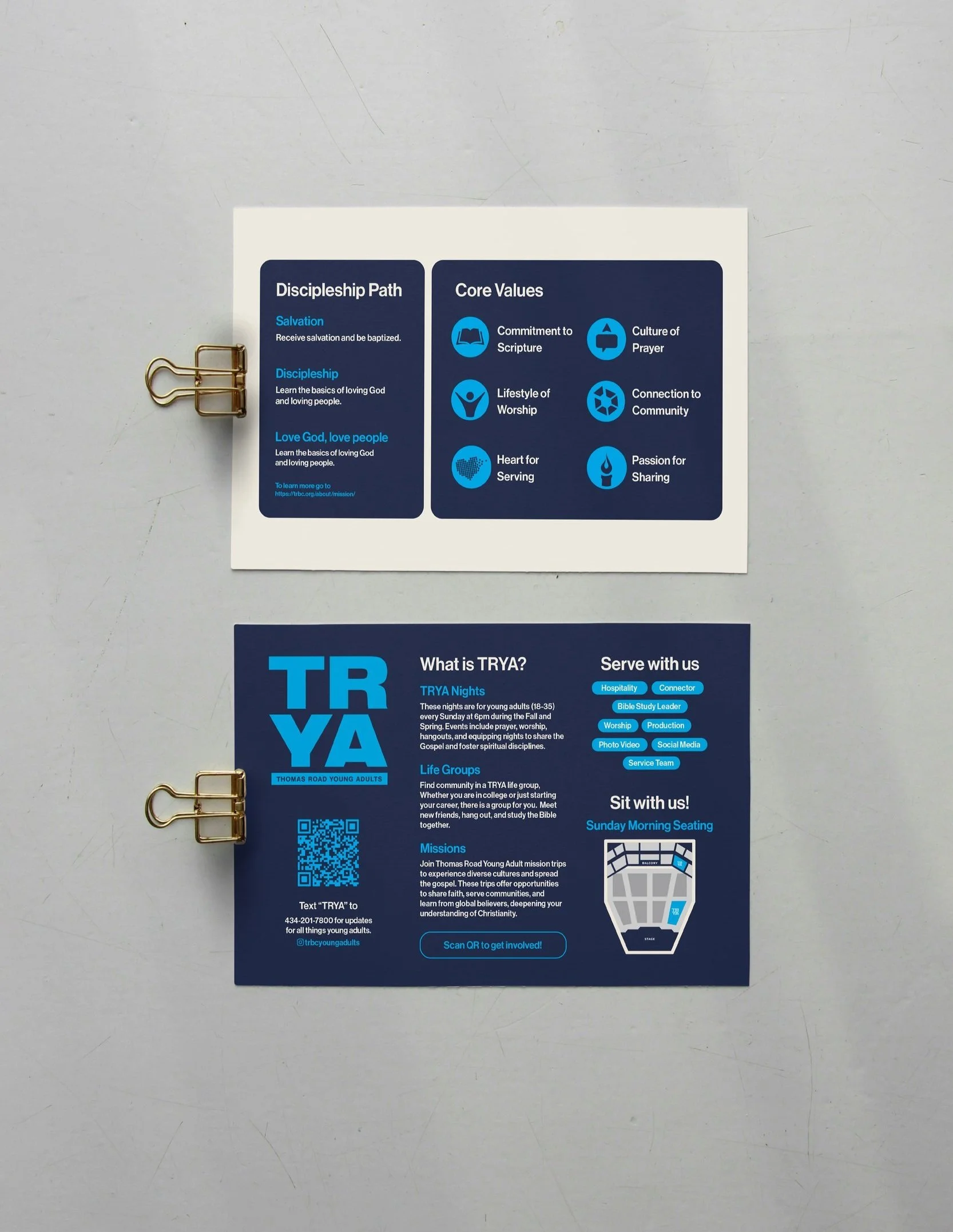 As part of my internship at Thomas Road Baptist Church, I had the opportunity to design T-shirts for TRYA (Thomas Road Young Adults) to represent their upcoming Fall 2024 series. These were a challenge to create as I could only use typography and a limit of two colors including the shirt color. These designs were crafted to reflect the themes and energy of the series, creating a wearable connection to the events. In addition to the T-shirts, I designed TRYA cards to be handed out to guests, encouraging them to attend and engage with the community. Each design aimed to capture the essence of the series while fostering a sense of belonging and excitement among young adults. This project allowed me to merge creativity with purpose, contributing to a meaningful ministry outreach.